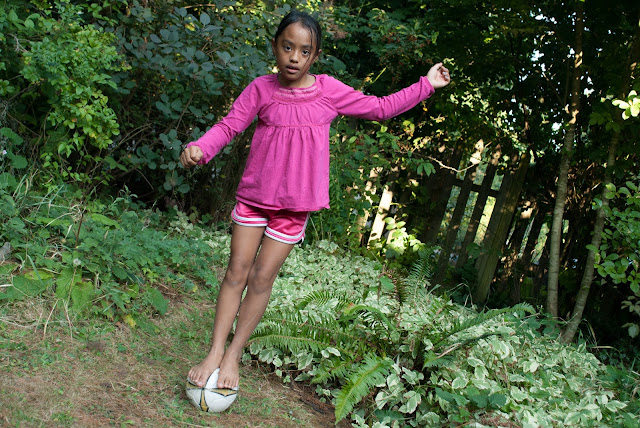 Watching her try to balance on the soccer ball reminded me of my own attempts this week to stay upright as things kept changing, and I'm drawn to her fierce concentration and the one drop of sweat hanging in the middle of her forehead like a crystal bindi.